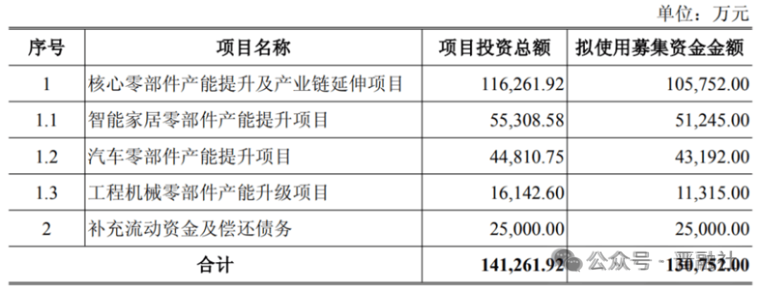 据华翔股份最新发布的募集平话审演讲显示,公司拟利用10。58亿元募集资金,该项目由智能家居零部件产能提拔项目、汽车零部件产能提拔项目、工程机械零部件产能升级项目形成。别的,华翔股份还拟利用2。5亿募集资金弥补流动资金及债权。